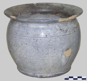 Objektbeschreibung: fragmentarisch erhalten. Auf der Drehscheibe hergestellt und hat eine bauchige Gefäßkörper. Innen und Außen Weiß Glasiert, 1 Henkel