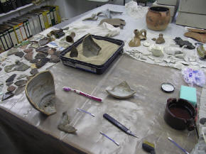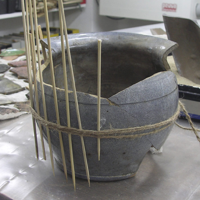 Konservatorischer Maßname: Abwaschen mit dem warmen Wasser und einschließende Trocknung. Mechanische Reinigung mittels Skalpell und Zahnbürste. Reinigung von Bruchstellen mit Ethanol. Kleben mit 50 % Polyvinylacetatdispersion (PVA)
