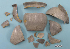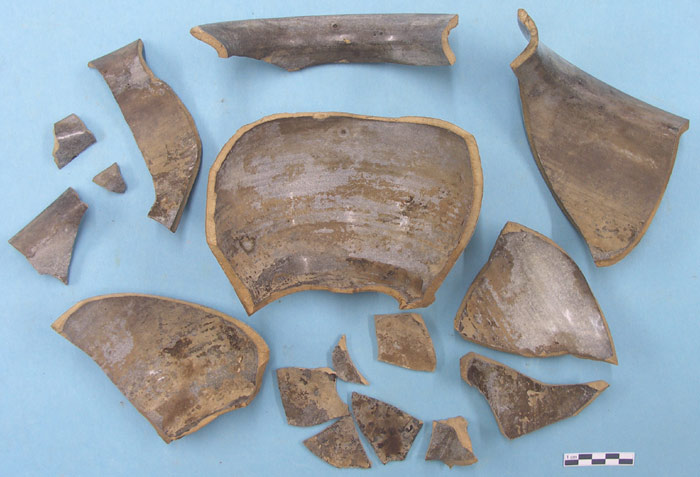 Vorzustand: Bodenfund. Zerdrückt. 16 Teile. Sinterkrusten in den inneren Bereich.